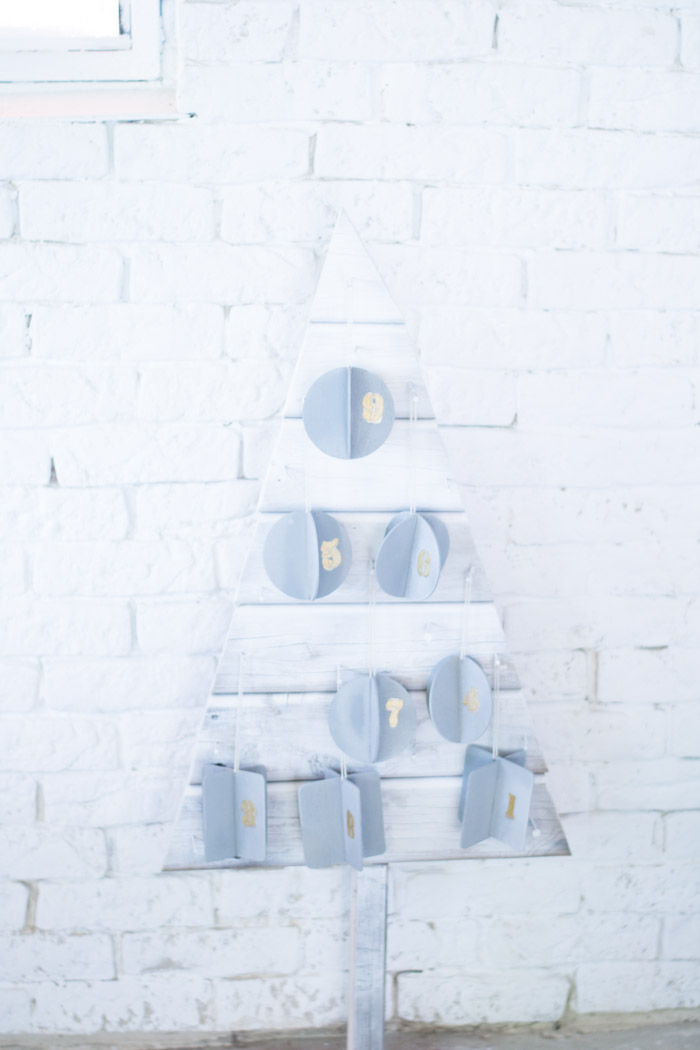Las pinté de color gris y con una plantilla de números los pinté de dorado. Con ayuda de un taladro, hice un agujero en la parte de arriba y una cuerda de algodón para colgarlos del árbol.