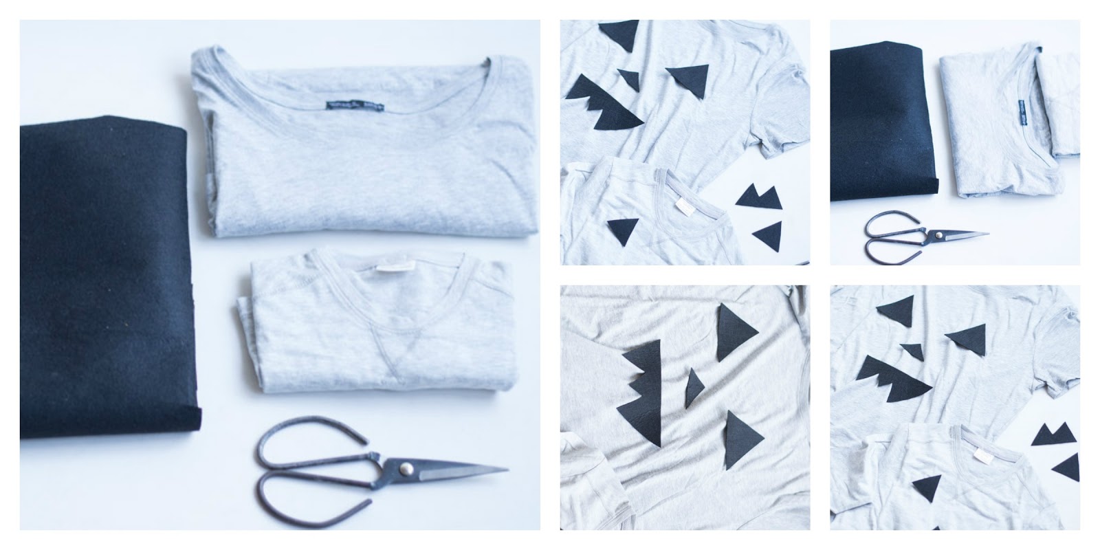 Hacer la forma que más os guste y coserla a la camiseta. Si es vieja, podeis usar pegamento de tela o silicona caliente y ahorrarte el paso de coser.