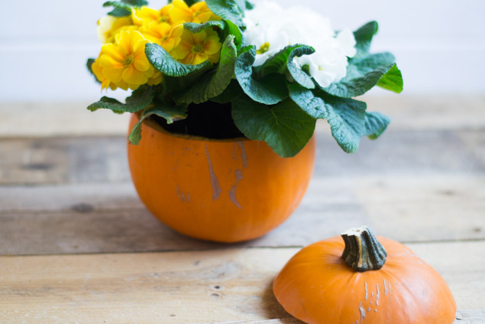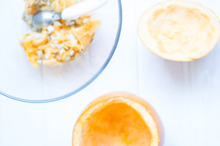Cortamos la tapa de la calabaza y empezamos a vaciar su interior, a mi este año me vino genial la cuchara especial para hacer bolas de helado. Luego retiramos las macetas de las plantas o flores, y le quitamos un poco el exceso de tierra.