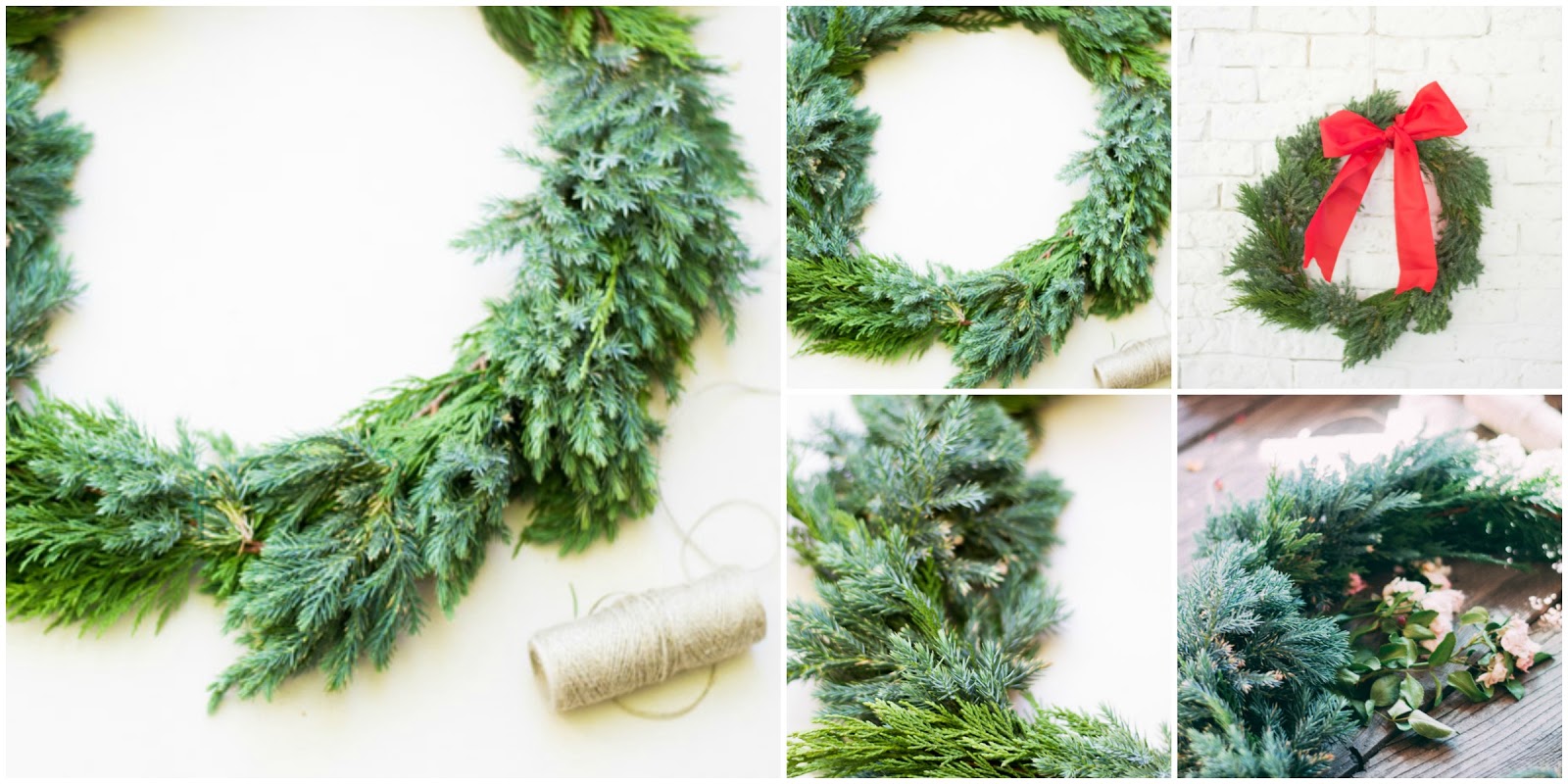 Necesitamos: Alambre gordo y fino, alicates, ramas verdes, cuerda y lazo rojo.