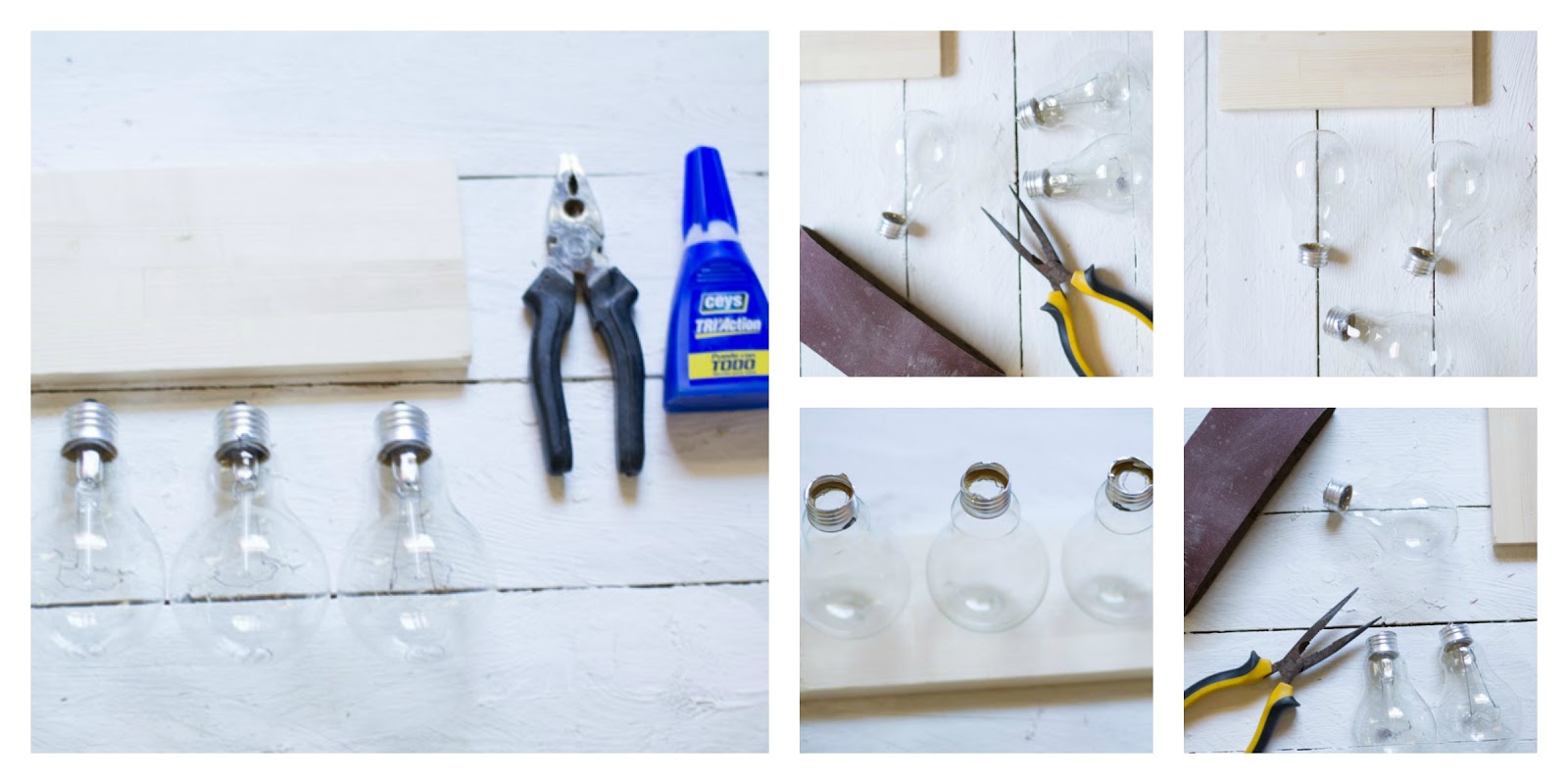 Con ayuda de una pequeña sierra y alicates, quitamos el mecanismo interior de nuestras bombillas. Lijamos un poco el contorno para no cortarnos.