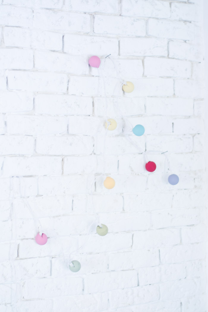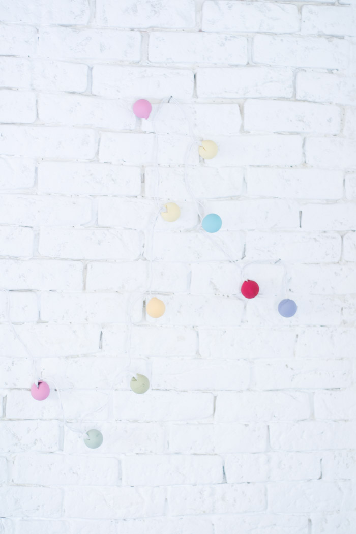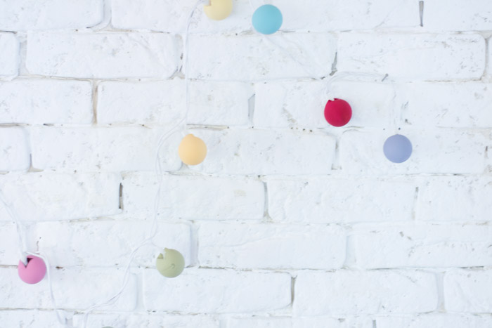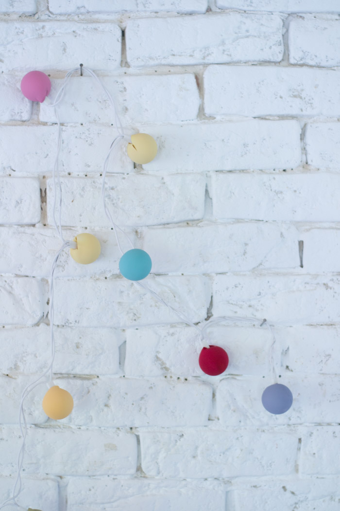 Una vez pintadas es tan sencillo como hacer dos cortes en la pelota para introducir las luces. Si lo que quieres hacer es una guirnalda solo necesitaras introducirla con una aguja e hilo para tener lista una bonita decoración para tu fiesta o celebración.