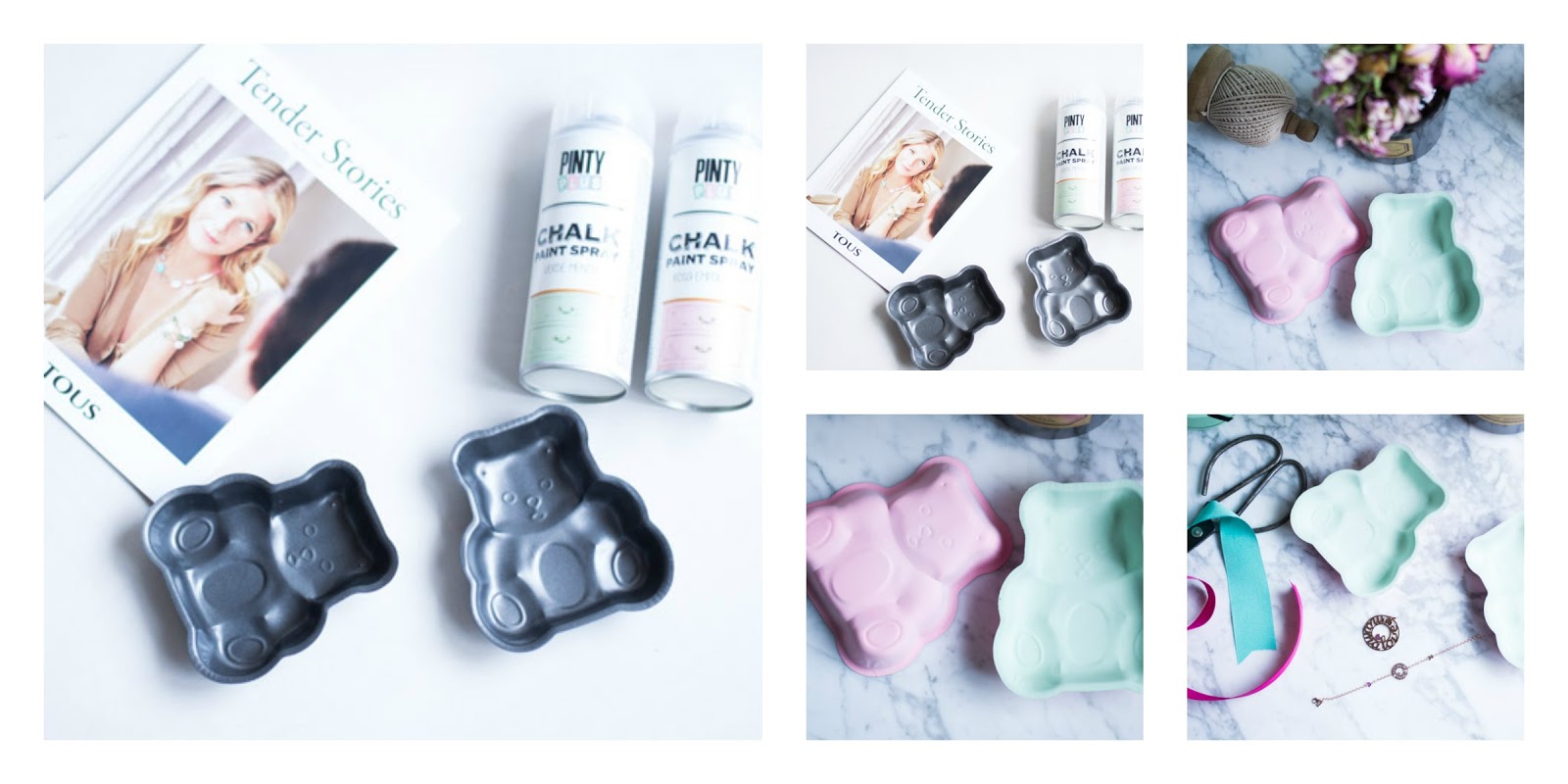 Y una manera original de presentar estas piezas, puede ser personalizando y customizando unos moldes de bizcocho, con un poco de pintura en spray y unos bonitos lazos.