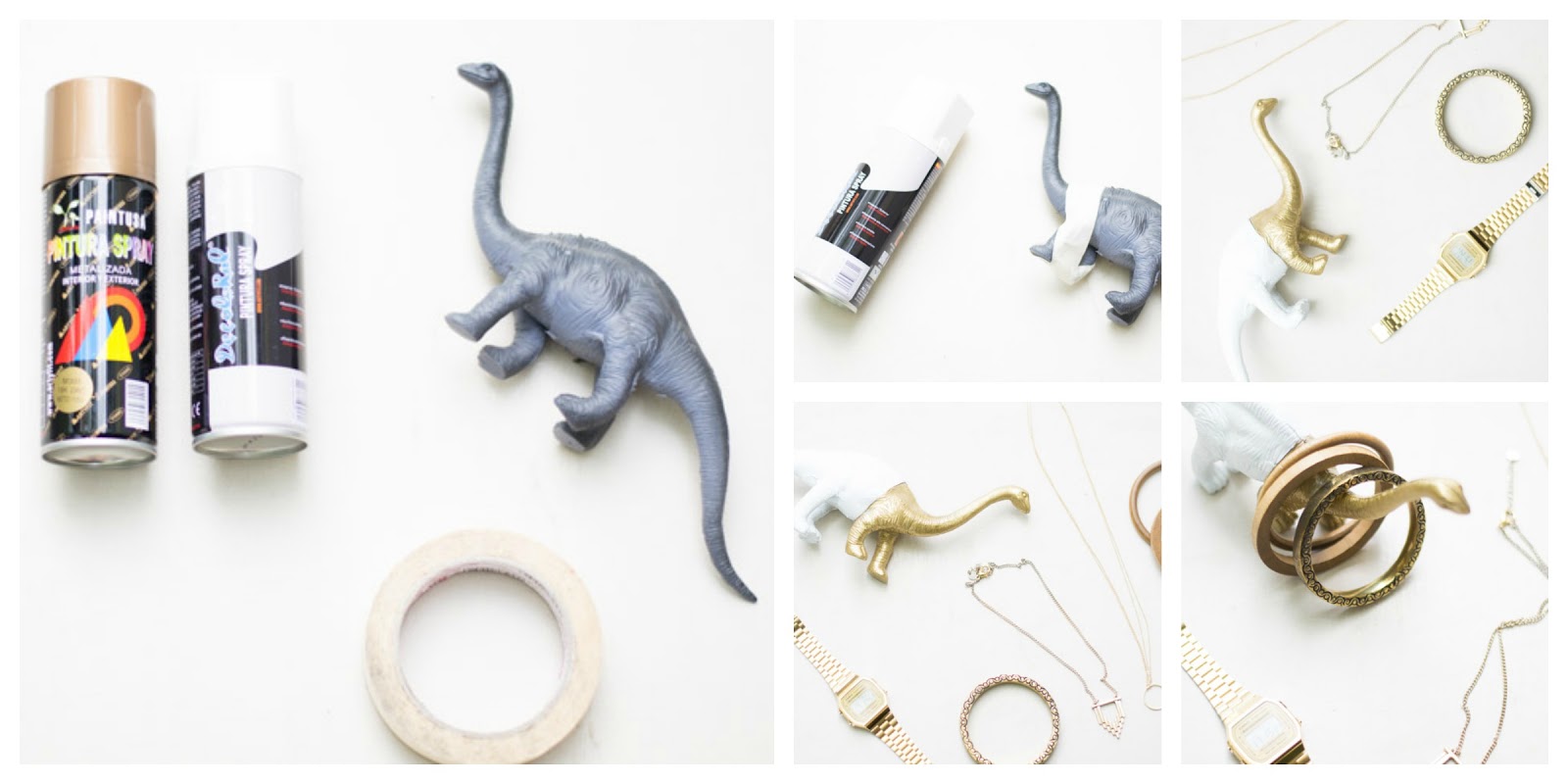 Necesitamos: Animal de plástico o juguete, pintura en spray blanco y dorado y cinta de carrocero.