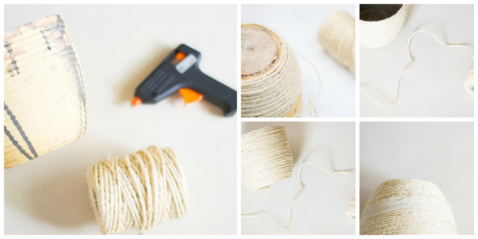 Vamos enrollando la cuerda desde la base, alrededor de todo el macetero con pegamento o cola. Una vez esté bien seco, podemos añadir a una parte cinta de carrocero y pintarlo.
