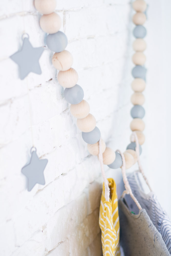 Solo hay que hacer una guirnalda con la cuerda y las bolas de madera. Yo las compré en una tienda de manualidades. Pinté algunas de color gris y fui montando la guirnalda.