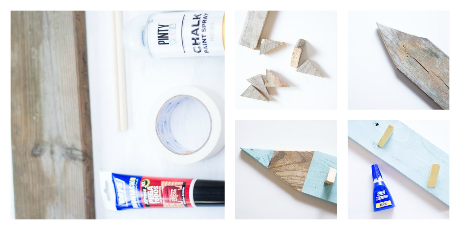 Cortamos los extremos de la tabla, para hacer una forma de lápiz. Ponemos cinta de carrocero en la parte de la madera, que no tengamos que pintar, y usamos el spray de chalk paint.